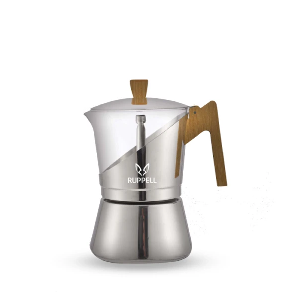 موکاپات روپل 6 کاپ از جنس استیل ضد زنگ دارای طراحی منحصر به فرد با ترکیب استیل و شیشه ضمن زیبایی ظاهری، این امکان را به شما میدهد که بدون باز کردن درب موکاپات میزان عصاره آماده شده را ببینید.