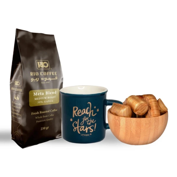 یک عدد دانه قهوه متا بلند مدیوم 50%عربیکا 250گرمی + ماگ 90 میل XHC براق رنگ سرمه ای + کانفت قهوه 400 گرمی