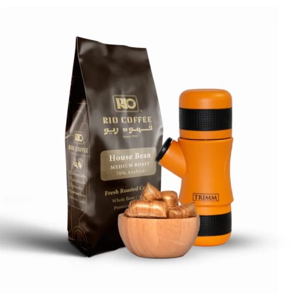 یک عدد دانه قهوه هاوس بین %70 عربیکا 250 گرمی + یک عدد مینی پرسو تریم رنگ زرد + کانفت کاکائو 400 گرمی