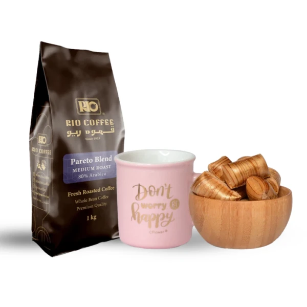 یک عدد دانه قهوه پَرِتو 80%عربیکا 1کیلویی + ماگ 90 میل XHC براق رنگ صورتی + کانفت دارچین 400 گرمی