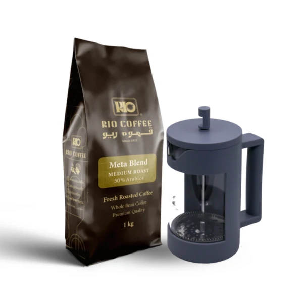 یک عدد دانه قهوه متا بلند مدیوم50%عربیکا 1کیلویی + فرنچ پرس وان کافی 800 میل دسته پلاستیکی رنگ طوسی